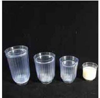 Four glasses of different sizes are shown, from large to very small. The large glass is full of milk. The performer pours all of the milk into the next smallest glass and it all fits perfectly. This is repeated with the next smallest glass and again all the milk fits into the smaller glass. This is repeated until all the milk from the largest glass fits perfectly into the tiny glass! An amazing trick! Can be performed in reverse, where the milk in the small glass fills the largest glass.
